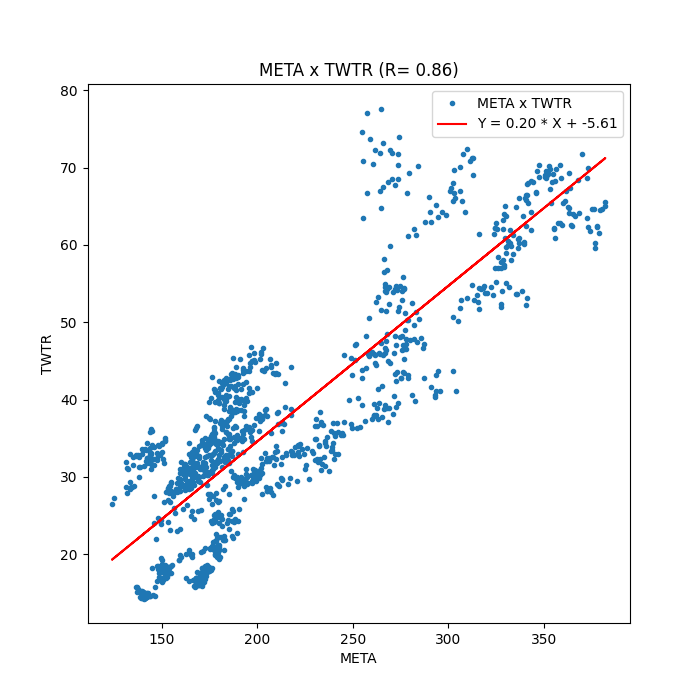 왼쪽이 페이스북과 스냅의 회귀분석으로, 그림으론 감이 안오는데 초반에는 높은 상관관계를 가지는 것 같다.
