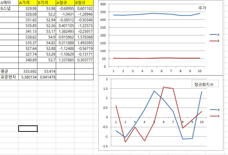 이를 해소하는게 정규화 가격으로 정규식은 정규화가격 = (현재가-평균가) / 표준편차 이다.