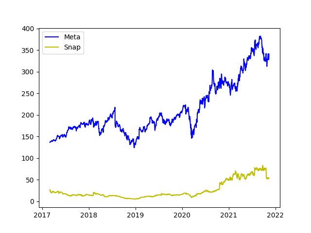 파이썬으로 matplotlib 라이브러리를 이용해서 다시 한 번 해봤다. 이번엔 2017년 스냅이 상장한 당시부터 현재까지의 데이터를 입력했다. 서로 어긋나는 부분도 있지만 균형점에서 만나려는 관성이 있는 것처럼 보인다.