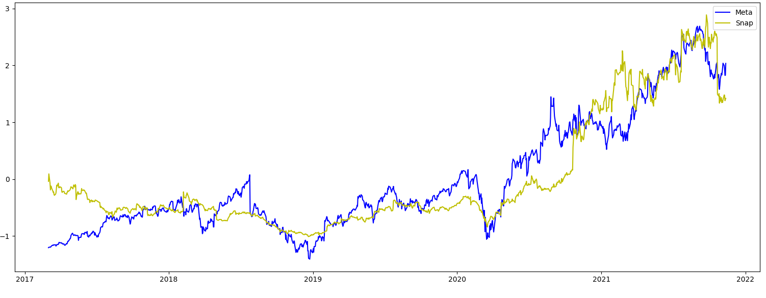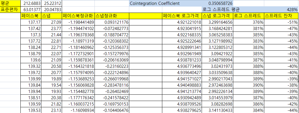 최근 데이터로만 봤을 때, 페이스북이 스냅보다 고평가되고 있다. 여기선 생략되었지만 한달 전에는 잔차가 한 자리수로 얼마 되지 않았다가 최근 2주간 잔차가 더 벌어졌다. 이럴 경우 스냅을 매수하고 페이스북을 매도하는 것이 전략이 된다.