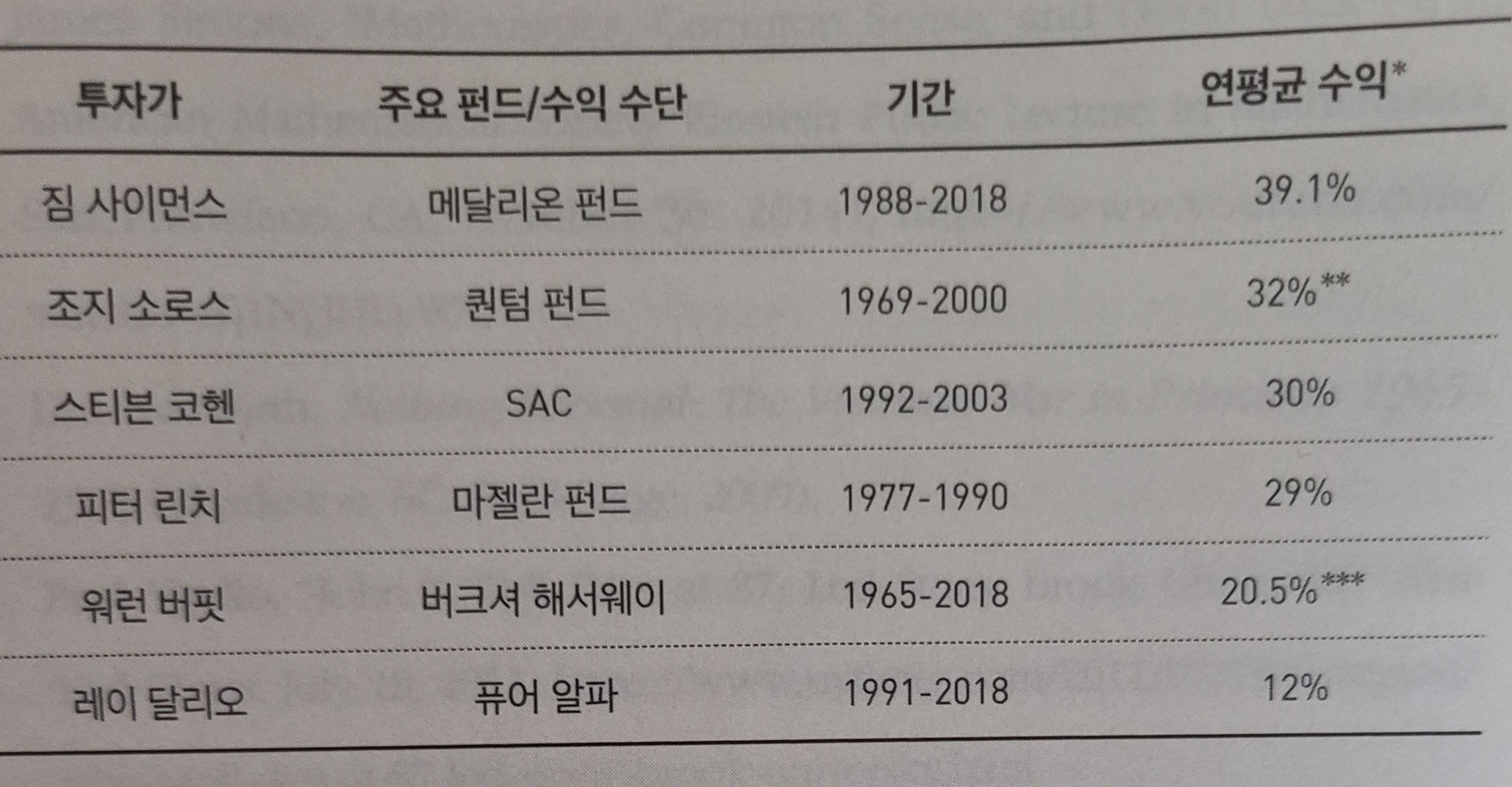 위 표는 책 부록에 달린 한 표인데 현재 가장 유명한 투자 대가들의 수익률을 비교한 것이다.