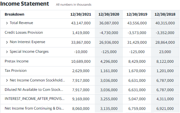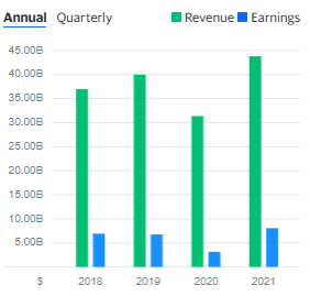 (매출, 순이익) 순으로 보면 2021년 기준, 비자가 $(241억,123억), 마스터카드가 $(189억, 87억), 아메리칸 익스프레스가 $(438억, 80억)였다. 아메리칸 익스프레스의 경우 매출은 높은 수준이었지만 순이익률이 낮았다.