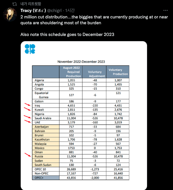 금일 있었던 OPEC 회의에서 일 200백만 배럴 감산이 합의되었다.