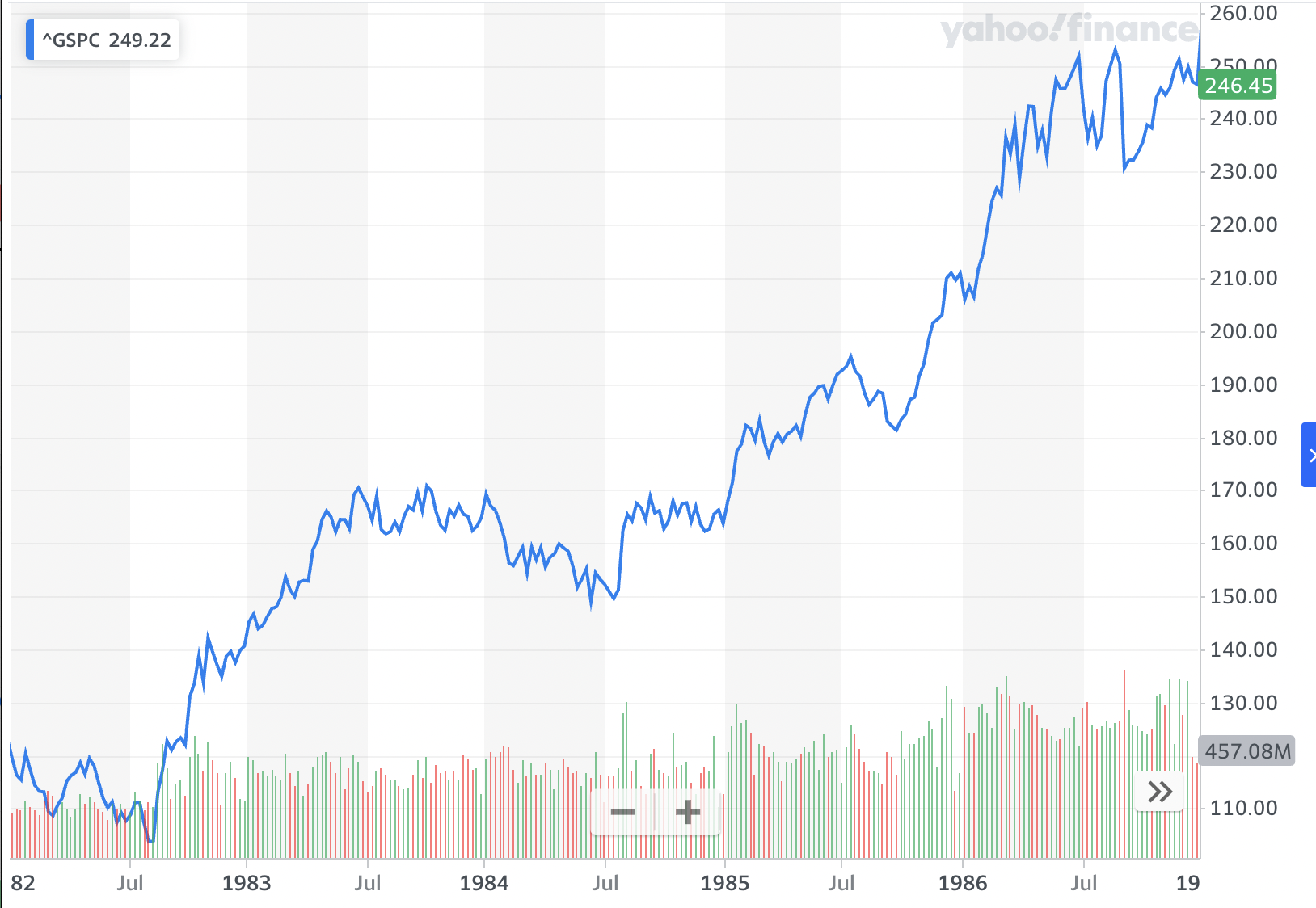 각각의 5년 후 기간을 보면 증시는 S&P500 기준 2배 이상 상승.
