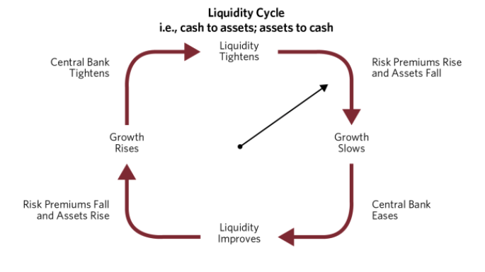 - 다음 스텝은 경제 약화이다. 다음 그림은 유동성 사이클에서 우리의 위치이다.