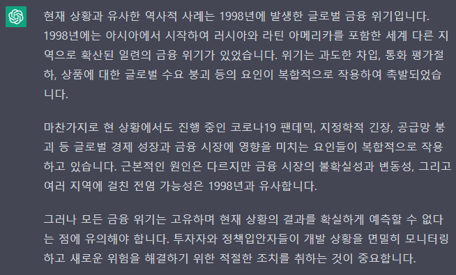 ChatGPT 쓰임새가 갈수록 놀랍다. 레이 달리오 정도나 되는 성실성을 가져야 역사에 대한 백테스팅도 할 줄 알았는데 이제는 단편적인 역사 사건을 찾아주는 것을 AI가 해준다.