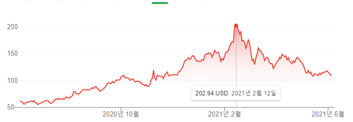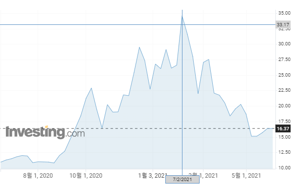 6월 첫째주 기준 주가는 16.37달러로 고가 대비 절반 수준이며, 5월부터 꾸준히 증가하고 있다.