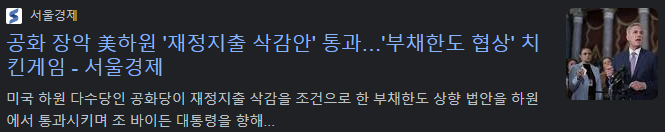 부채한도 상향 또한 이슈인데, 26일 공화당이 재정지출 삭감안을 포함한 부채한도 상향안을 하원 통과시켰다.