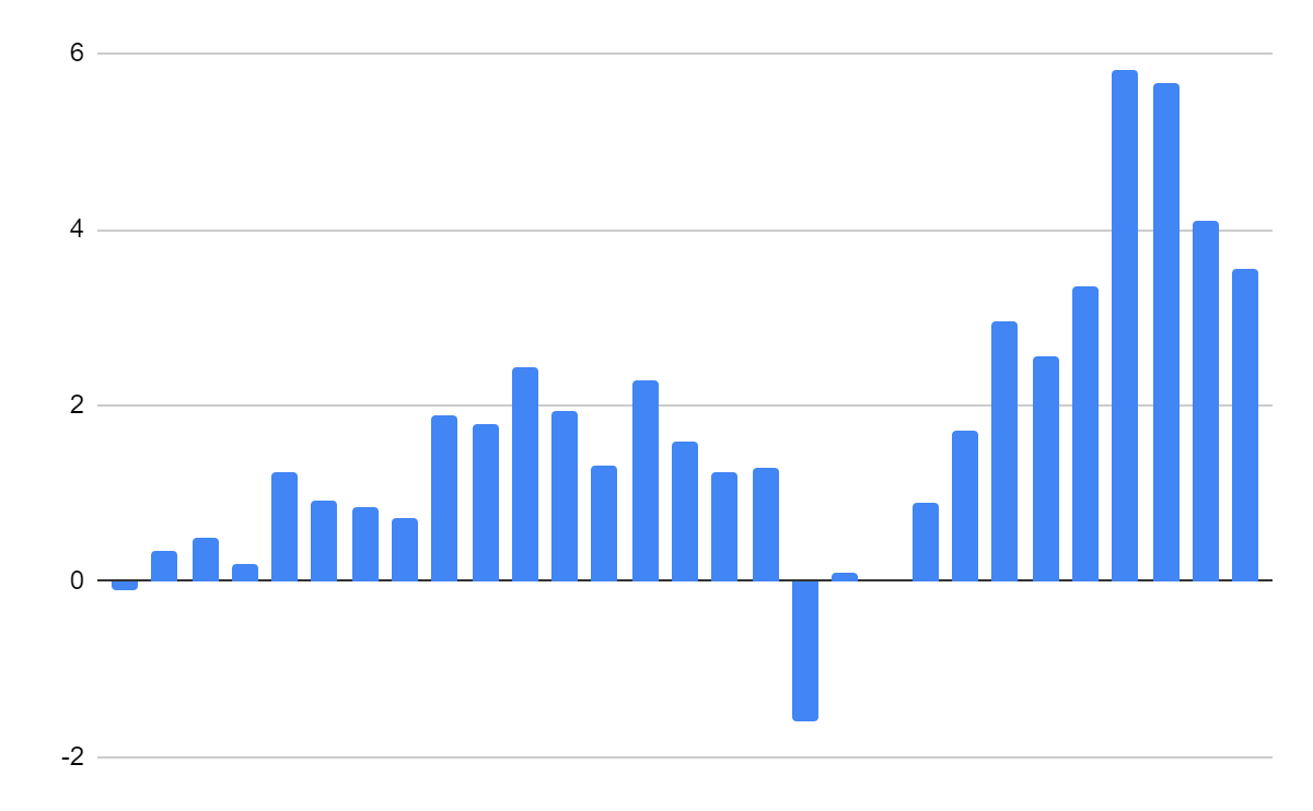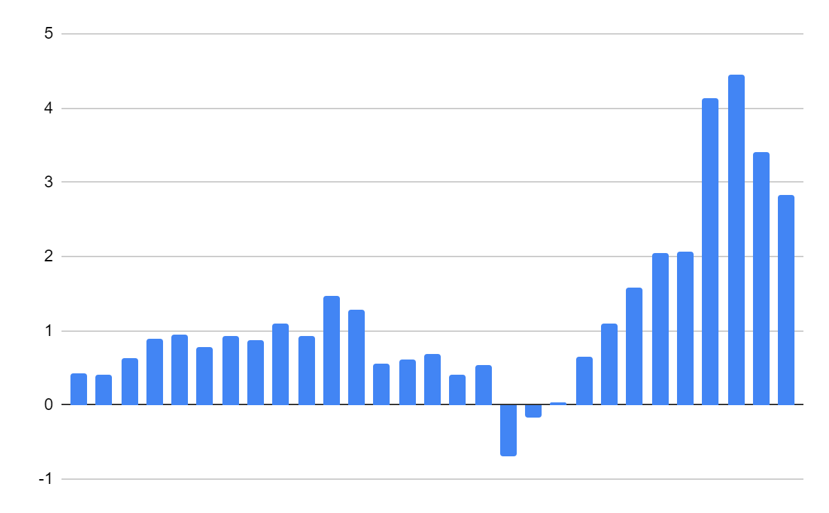 침체 우려와는 달리 노동시장은 생각보다 탄탄한 것 같다. 코로나 정점을 찍고 미국의 실업률이 4% 밑에서 유지된지가 벌써 1년이 넘은 것 같다. 최근에도 별 변동없이 자연 실업률이라고도 말할 수 있는 3% 중반대가 유지중이다. 다시말해 노동시장이 정말 고요하다 싶을 정도로 튼튼하다.