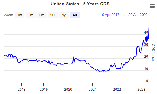 이와 관련한 미국 디폴트 확률은 2~3%라고 래리 서머스가 언급한 바 있다. 위안화 강세도 미국의 지위가 흔들린다는 이슈 중 하나이며, 미국 CDS 프리미엄이 역대 최대를 계속해서 경신하고 있다.이가 계속 상승하는 원인에는 디폴트 우려, 국채 헷지 등으로 꼽힌다.