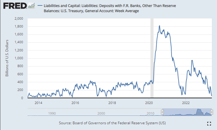 => 부채한도에 도달해 재무부가 돈을 더 풀었고 이로 인해 연준의 긴축에도 불구하고 유동성이 유지됨
