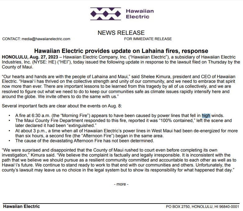 즉, 오전의 화재는 책임이 있으나 오후의 화재에 대해서는 책임소재가 밝혀지지 않은 상황이다. 덧붙여 자체조사도 없이 소송을 건 마우이 카운티 측을 지적하고 있다. 본 입장에 따르면 마우이 측은 책임을 피할 수 없는 상황이다.