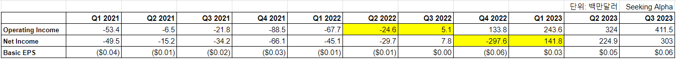 다음 표는 21년 1분기 부터 23년 3분기까지 누뱅크의 영업이익과 순이익, EPS 추이를 나타낸다. 영업이익(Operating Income)은 22년 3분기 플러스 전환 후 유지되는 추세를 보인 반면, 순이익(Net Income)은 23년 1분기에 본격적으로 플러스 전환된 것이 특징이다.