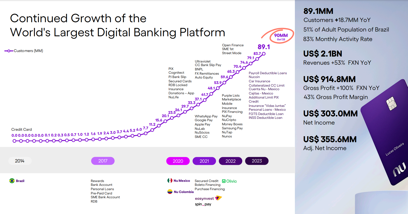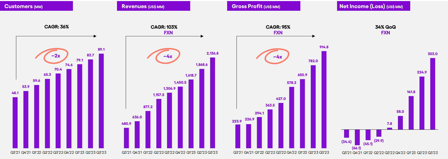 지난 글에도 언급하였듯 누뱅크의 가장 두드러지는 강점은 고객 및 매출 성장에 있다. 다음은 23년 3분기 발표 기준 자료이다. 누뱅크는 2013년 설립 이후 대략 10년 여 간 9천만 명의 고객수를 유치하였다. 매출액은 21억 달러, 매출총이익 9억 달러, 순이익 3억 달러에 도달하였다. 연간 성장률은 매출액이 53%, 매출총이익이 100%이다.
