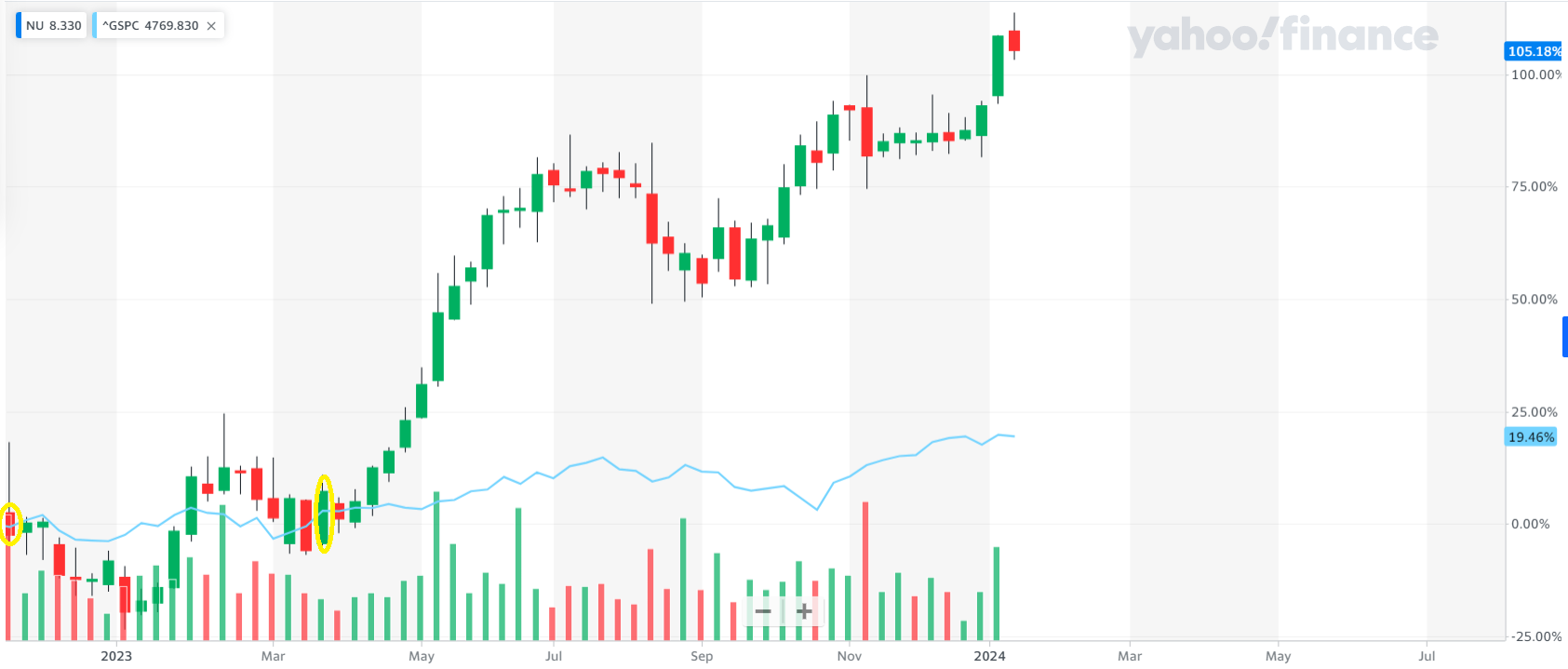 누뱅크의 영업이익은 22년 3분기 흑자 전환하였고 당기순이익은 23년 1분기 흑자 전환하였다. 각 발표일은 다음 차트에 노란색 원으로 표시하였는데, 23년 1분기 실적 발표 당시 당기순이익 흑자전환 이후 주가 회복세가 두드러지는 모습이다. 하늘색 선은 S&P 500선인데 동기간 19.46% 상승한데 반하여 누뱅크는 105.18% 상승하였다.
