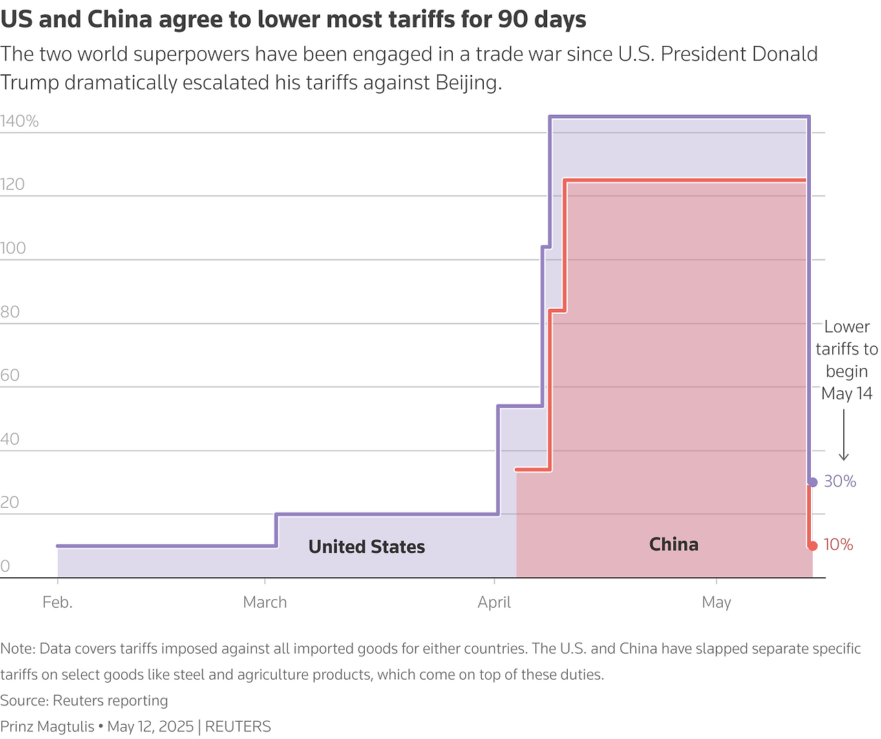 발표 결과, 미-> 중 30%, 중->미 10%로 100%p가 넘는 관세율을 롤백하였다.