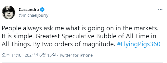 "역사상 가장 큰 버블이다." 마이클 버리 트윗 본문