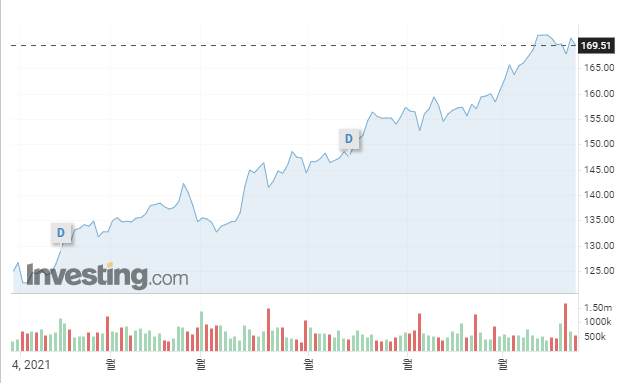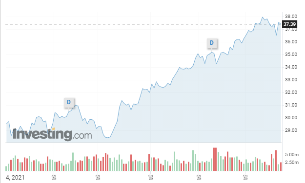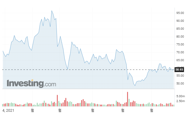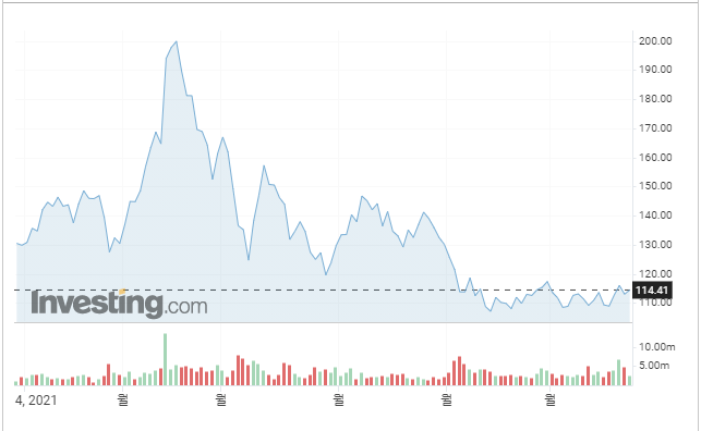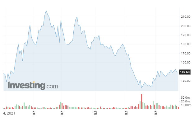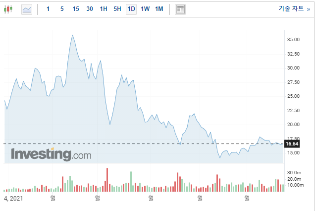 지난 겨울에 고점을 찍고 꾸준히 하락하고 있다. 최근엔 낙폭이 거의 없다시피 횡보하고 있다.
