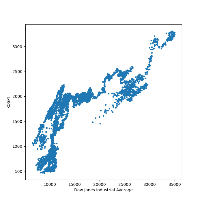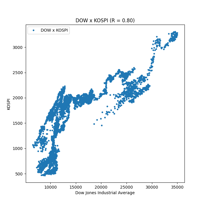 다우존스와 코스피의 상관관계를 나타낸 회귀분석 표이다. 100을 기준으로 했을 때 76정도의 상관계수이다. 설명력(R)이 0.8 정도되는 회귀분석이다.
