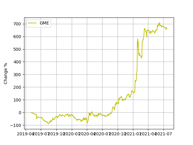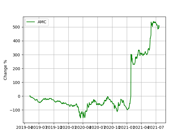 나름 응용해서 얻어본 게임스탑과 AMC의 누적 수익률 그래프이다.