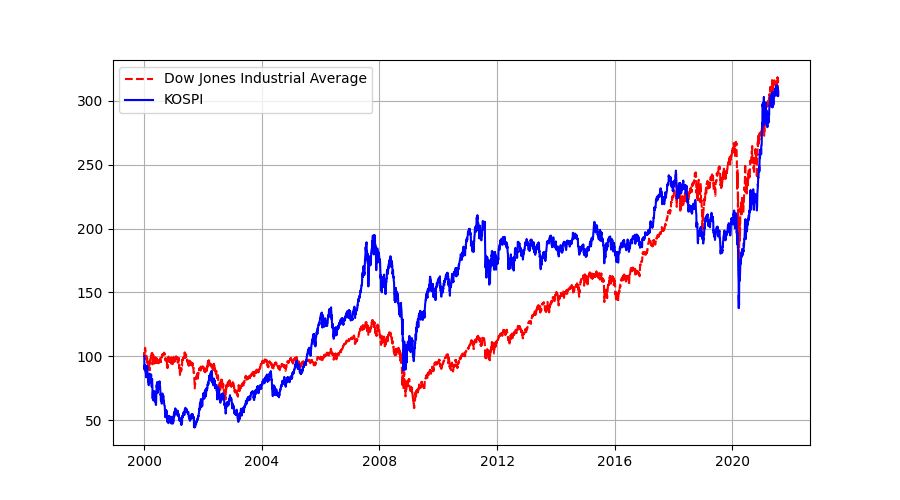 지난 20년간 다우존스와 코스피의 성장률을 상대적으로 비교한 표이다. 코스피가 다우존스보다 더 민감하게 움직이는 모습이다.