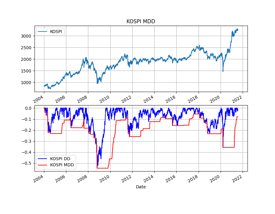 최고점 대비 최저점 낙폭을 표현하는 맥디를 코스피로 나타낸 표이다. 2008년(리먼 사태), 2020년(코로나 폭락) 등이 눈에 띈다.