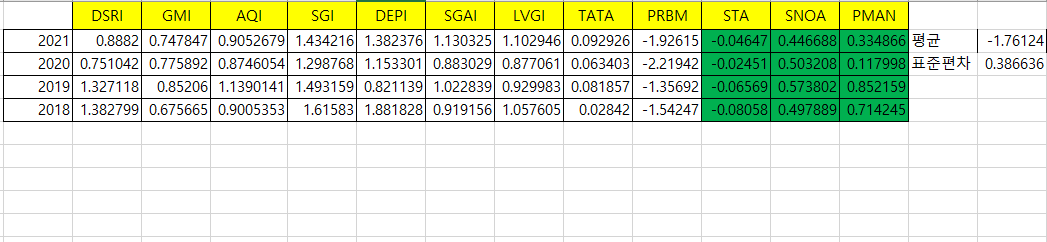 STA, SNOA, PRBM을 구하기 위한 데이터이다. 전부 월스트리트 저널에서 직접 긁어왔다. 표에 테두리 안된 부분을 보면 잘 알 수 있다. 이를 이용해서 아래와 같은 결과를 도출했다.