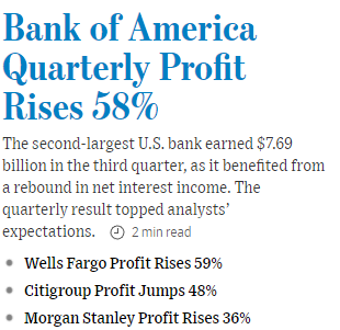 뱅크오브아메리카(BAC), 모건스탠리(MS), 웰스파고(WFC), 씨티그룹(C) 등이 3분기 예상치를 상회했다.