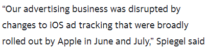 하락을 맞은 이유는 애플에서 IOS에 대한 광고정책 발표 때문이다. 간략하게 말하면, 기존에 앱을 제공하는 회사들이 광고에 필요한 고객의 데이터를 직접 수집하는 경우가 일반적이었는데, 애플 측에서 이 데이터 수집을 엄격히 제한해버린다고 발표했다. 고객 데이터를 수집하지 못하면, 광고를 제공하는 데에 타격이 있다. 그래서 오늘 스냅을 포함한 페이스북, 구글, 트위터, 핀터레스트 등 많은 광고기업들이 하락세를 보였다.