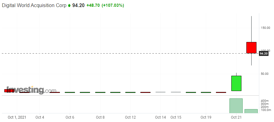 Digital World Acquisiton은 불과 이틀 전만 해도 10달러 수준이었다. 다음 날인 21일, 52달러까지 올랐다가 45달러에 멈춰 섰으며, 그다음 날 22일, 175달러까지 갔다가 94달러로 마감했다. 장외시장에선 변동이 더 컸던 것으로 기억한다.