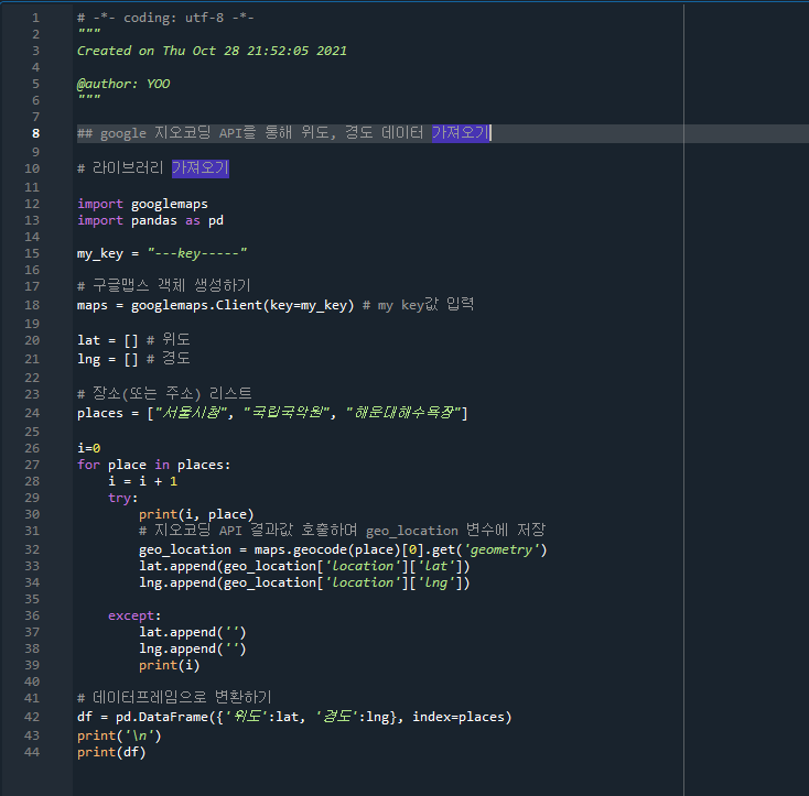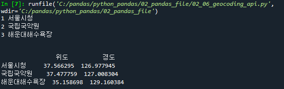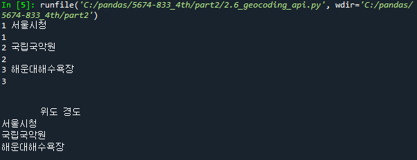 위와 같은 코드로 지오코딩 API를 활용해 위도와 경도 데이터를 가져오려 했다.