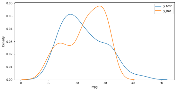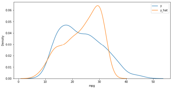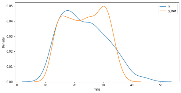 자동차 중량과 연비의 관계를 단순회귀분석. 파란색이 실제 값, 주황색이 예측값. 아직 오차가 있다.